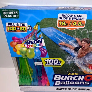 Zuru,NWT, Bunch O Balloons, 16FT, Throw Go, Slide & Splash water slide wipe out, 100+ self sealing balloons included, for ages 5 to 12