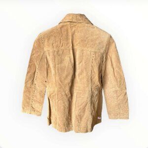 This brown leather jacket features two pockets and a button enclosure.