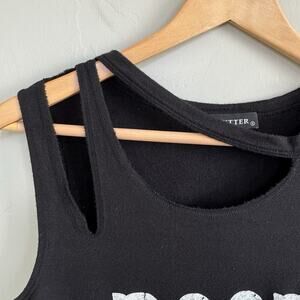Fun and flirty black sleeveless tank from Zutter featuring bold Western-style text that reads “Boots, Class, and a Little Sass” with blue and white distressed lettering and boot graphic. Features trendy cutout strap detail at the neckline. Great for country concerts, rodeos, or everyday cowgirl vibes. Pre-owned and in excellent condition. Tagged size small.