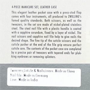 Description: Four-piece nailcare set includes nail scissors, cuticle scissors, a sapphire nail file, a slant tweezer, plus a black leather case with snap fastener to hold them securely.