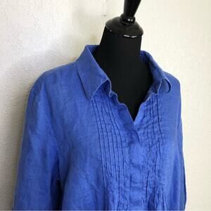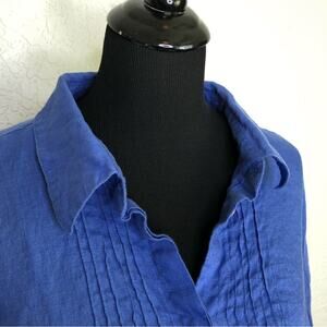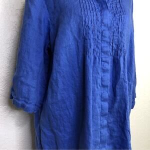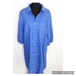 Zyga Lin’n Laundry blue linen button down midi dress. Collared with full button down front. Button cuff sleeves. Pleated on front. Midlength sleeves. Size 40 or US Medium. Good preowned condition. A couple of spots on sleeve. Minor imperfections in fabric from linen.