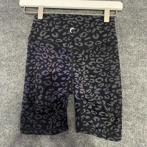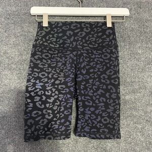 Features: black biker shorts, high rise, longer inseam, leopard print with allover reflective design that changes color in the light
