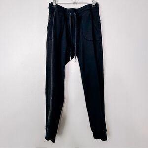 Details: Good gently worn condition, thick waistband with drawstring, flat front pork chop side entry pockets, comfortable stretchy fabric, thick and not see through, tapered ankle, great for lounging or working out