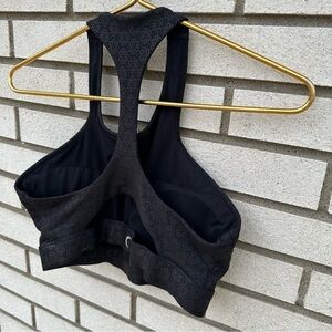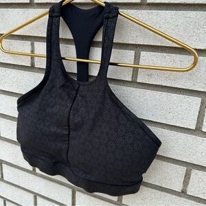 Tailored racer-style bra with faintly shimmering flowers. Turn this way and that to make the flowers appear and recede in the changing light. Open back and a vertical slash of mesh running down the center front. Will keep you cool and dry. A high-fit neckline lets you focus on your training, while the full soft lining protects your skin from even the idea of chafing. 4-Way Stretch. Sweat Wicking. Medium Support. Lined. Sharp racer styling emphasizes and flatters the back. 1.5" (3.8cm) encased bottom band for smooth support. Large ventilation zone in the back helps manage moisture and heat. Removable cups let you choose how to wear it. Wide elastic bottom band stays in place without pinching or rolling. Fabric: 86% Nylon, 14% Spandex. Size M. Excellent used condition.