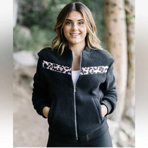EUC Zyia Active Black Leopard Flying V fleece jacket, zipper front, 2 pockets, logo on back left near waist, elastic band at cuff and waist, 20.5” PTP 24” length, 100% poly, excellent condition, smoke free home