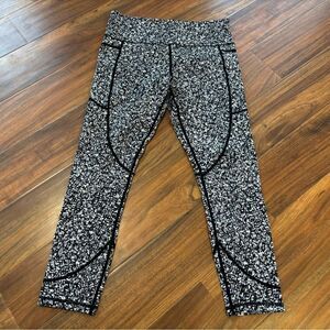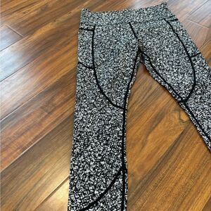 Zyia Active Black Pocket Mosaic Soft n Snug Mid Rise Patterned crop Leggings. Black/white/grey. Athletic. Side pockets. 73% nylon, 27% spandex. Waist across front 14 inches. Inseam 23 1/2 inches. Size 8-10. Great condition!