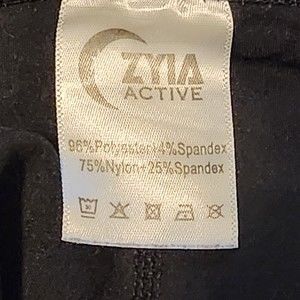 Fabric: 96% Polyester 4% Spandex main. Waistband: 75% Nylon 25% Spandex.