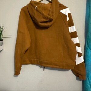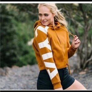 Make a bold and sporty statement with this Zyia Active cropped hoodie sweatshirt in a rich rust-orange hue, size XL. Featuring a drawstring hood, relaxed crop fit, and a dynamic white geometric logo stripe down the sleeve, this hoodie blends cozy comfort with athletic edge.