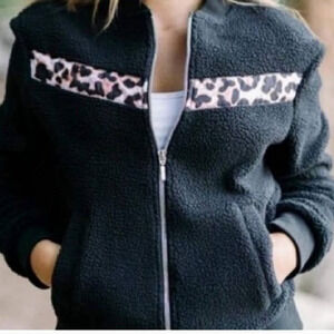 Black animal print fleece zip up jacket. Line of animal print in brown, black and white across front. Front pockets. Soft and comfortable.