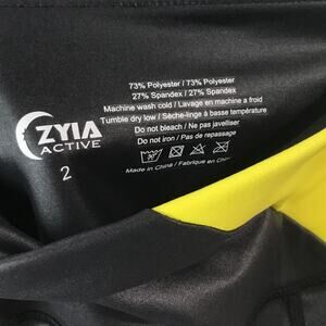 Zyia metallic asymmetrical black and yellow two tone leggings. Light n Tight style, compressive. No pockets. Fitted design and high quality fabric. High waistband. Durable seaming. 4 way stretch. Compression. Muscle support. Sweat wicking. 73% polyester, 27% spandex. Machine wash. In preowned condition.