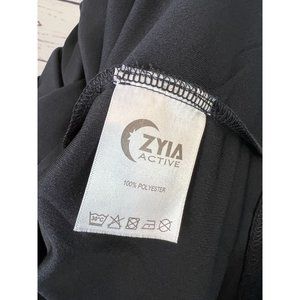 Zyia Active Mens Short Sleeve Tee Shirt XL Extra Large Athletic fitness workout gym trainer graphic T-Shirt. Black in color. 100% Polyester. Made in china. Pit to pit 23", back bottom of collar to bottom of shirt 29". Spell out Z Y I A on the front of top. Great preowned condition with no rips or stains. perfect for the athletic active fitness gym rat.