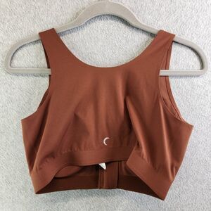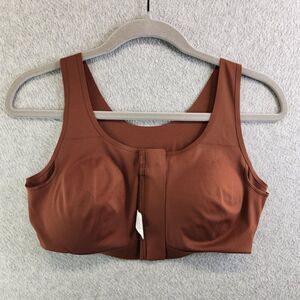Size medium. Coffee brown front zip sports bra. Nylon and spandex. Padded cups are removable.