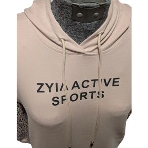 This cozy and stylish hoodie from Zyia Active is a must-have for your athleisure wardrobe. The body is a soft, blush-pink color with "ZYIA ACTIVE SPORTS" printed on the front, while the long sleeves feature a trendy leopard print. It has a relaxed fit and a drawstring hood, making it perfect for throwing on after a workout, running errands, or just lounging at home and school.
