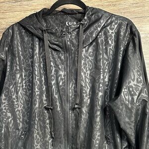 Elevate your style with this chic black bomber jacket. Featuring a unique pattern and a comfortable hooded design, it's perfect for any casual outing.