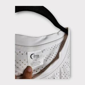 Tags: Zyia Active, workout tank, perforated mesh, breathable, athletic wear, gym top, running, white tank, activewear, women’s large