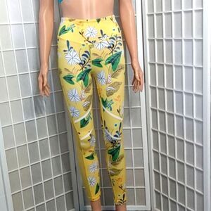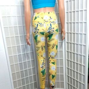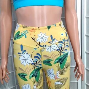 Vibrant yellow leggings with a floral pattern by Zyia Active, with a sheer yellow mesh down each side of the leg. Great quality. Wide waistband