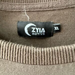 Zyia Active men’s fitted pullover crewneck in an olive army green with vertical chest zipper pocket. Sort of a cross between a sweatshirt and a T-shirt. It does not have a fleece lining, but it does have rib trim at neck, cuff, and waist. Thumb holes. Cotton, polyester and elastic blend. Length flat measures29 inches shoulder to him and 23.5 inches armpit to armpit.