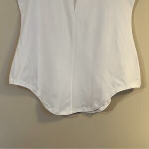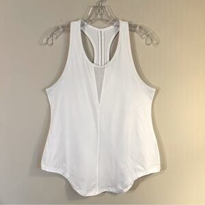 White “Long Effortless Tank” with 1.25”-wide shoulder straps, scoop neck, and mesh details on front and back of shirt. Super soft and stretchy material; tagless for added comfort. Excellent condition!