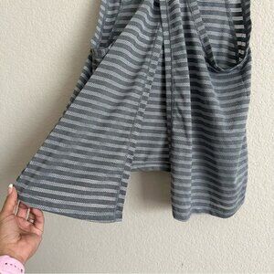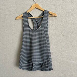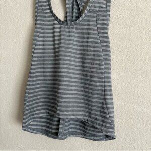 Stylish gray striped tank top with open back design. Perfect for casual wear.