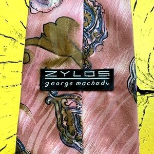 Zylos George Machado Men’s Tie. 100% Silk. Mauve Base w/ Brown & Purple Paisley. 4 inches at its widest point ( see photo) This bold tie makes a statement. Excellent Condition.