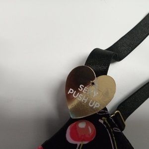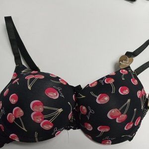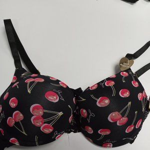 This bra is a lightly underwire beautiful black with cherries on the cups bra. IT is molded and has a push up that is so comfortable that your girls will hardly know that you are wearing a bra. Brand new with tags on it.