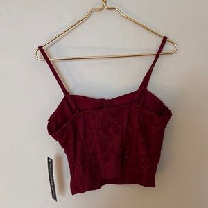 Elegant burgundy lace tank top. Features delicate straps. Perfect for layering or wearing alone.