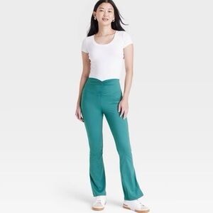 Green flare leggings with a ruched waistband. Perfect for versatile styling. Comfortable and trendy. 1 pair in a women’s size large 12-14. 80% polyester and 20% spandex. New in package.