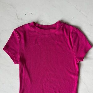 Bright fuchsia tee with short sleeves. Soft and stylish for everyday wear.