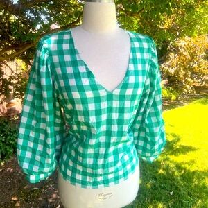 Chic green plaid blouse with V-neck. Perfect for casual wear. Pairs well with jeans or skirts.( pit2pit 21’ length 24” approximately )