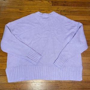 Soft lavender sweater with ribbed cuffs and hem. Crew neck design. Hip length on me at 5’7”. Perfect for layering.