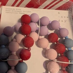 Stylish multicolor bead crossbody phone strap with vibrant colors. Features a gold tone clasp.