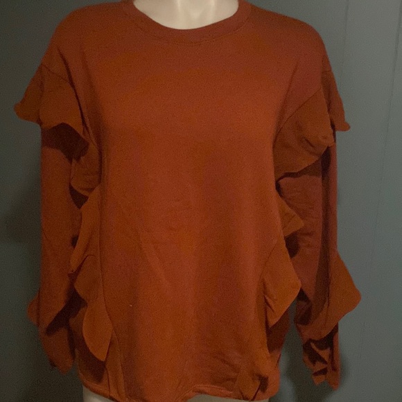 Rust-colored sweatshirt with ruffle details on sleeves. Crew neck design. Casual and stylish.