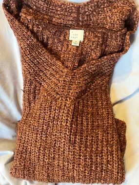 Soft textured knit V-neck sweater with relaxed fit. Long sleeves and ribbed hem. Warm rust-brown hue for autumn looks. Easy to layer for casual outfits.