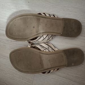 Elevate your summer style with these chic sandals from a new day, featuring a sophisticated tan and cream color palette. The wide crisscross straps provide a secure fit, while the flat sole ensures all-day comfort. Perfect for casual outings, these sandals effortlessly combine fashion and function.