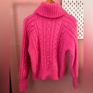 Bright pink chunky sweater with a cozy turtleneck. Features intricate cable knit design. Ideal for chilly days.