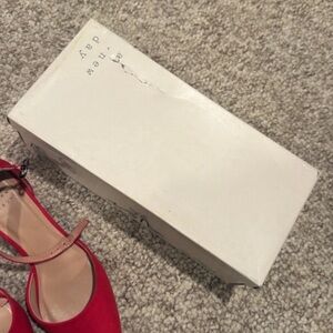 Bold red heels with a sleek pointed toe. Features an elegant ankle strap for added style.