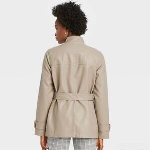 Brand new with tags. Size Small. Anorak jacket offers chic, lightweight outerwear in a pretty faux leather finish with lots of fashionable details. This below-hip anorak features four flap pockets on the front and a hidden full-length front zipper for an attractive amount of texture and detail, while built-in belt loops with a waist-tie belt let you cinch the middle to create a stunning silhouette.
