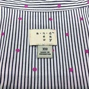 Like new "a new day" button down shirt with front pocket. It is white with thin navy stripes and small pink polka dots. The shirt is 100% cotton and has no stretch to it. The sleeve length is 23", pit to pit is 18" and the length from shoulder to hem is 26".