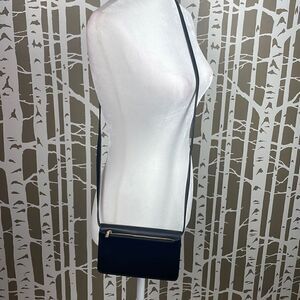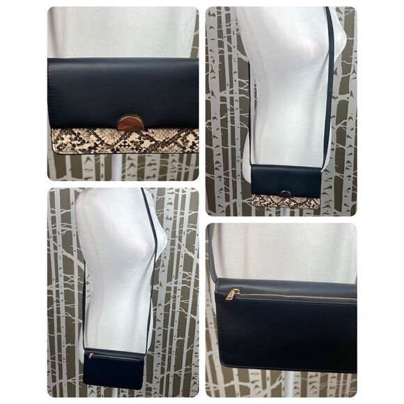 a new day Black Faux Leather & Faux Snake Crossbody Wallet Bag. Features black faux leather body with black & tan faux snake embossed front, gold half circle snap closure, snap off removable crossbody strap, two credit card slips inside the main compartment, back zip close pocket. Brand new without tags but it does have light hardware scratches on the snap closure (see pics). This is perfect for travel - carry as a crossbody or remove the strap and use as a wallet.