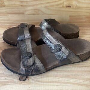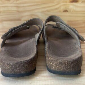 Natural cork and PU midsole is shock absorbent and molds to the foot for a unique fit.