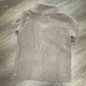 cozy teddy fleece Sherpa jacket with pockets and full-zip. Features faux leather trim and pocket. Light brown color.