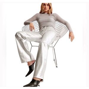 The product is an Abercrombie & Fitch women's jean in a relaxed fit with a high rise. It is a size 24 in silver color with a straight style, reflecting a 90s theme. Made of denim fabric, this jean is designed to provide a comfortable and stylish look for women who appreciate a vintage-inspired aesthetic.
