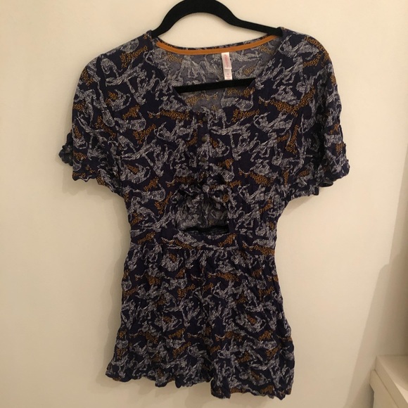 it’s a lightweight size small navy blue romper! The pattern looks kind of like abstract cheetahs and dots???? but could be interpreted differently. it’s a little wrinkly in the photo my bad. also there’s a open section just under the bust that adds some visual interest (shown in photos)