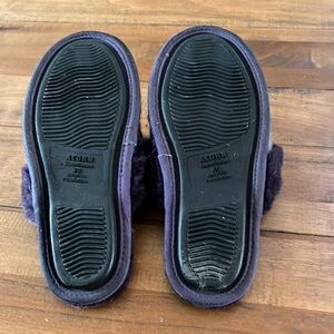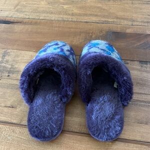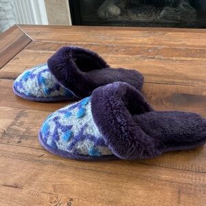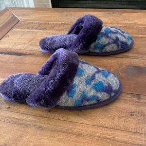 Acorn slippers, size 6, faux purple fur lined, wool design purple and blue