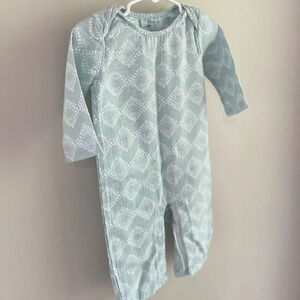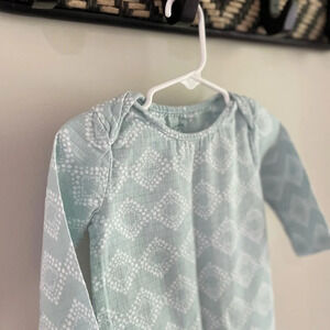 Soft and comfortable bodysuit. Features a light blue color with a geometric pattern. Long sleeves for warmth.