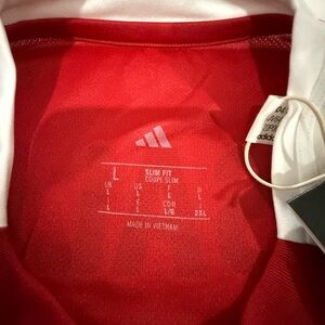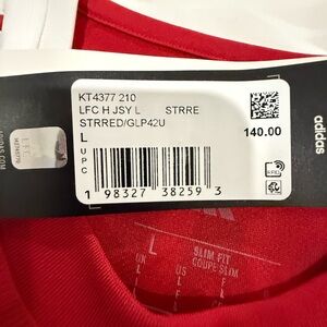 Vibrant red Adidas jersey with white stripes. Features Liverpool crest and sponsor logo.