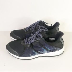 Stylish adidas athletic shoes. Black upper with gray accents. Perfect for workouts.
