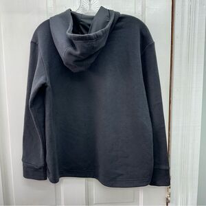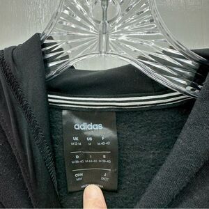 Classic adidas hoodie. Black with white logo and stripes. Comfortable and stylish.