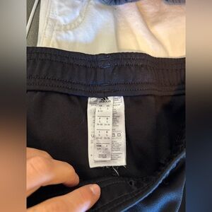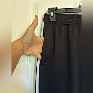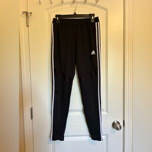 Sleek black track pants. White side stripes. Comfortable fit. Iconic adidas logo.