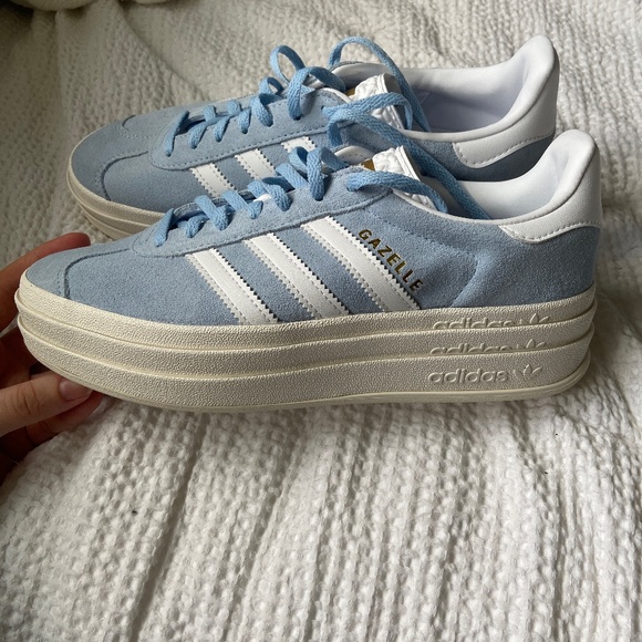 Stylish adidas Gazelle sneakers. Light blue suede with white stripes. Comfortable platform sole.